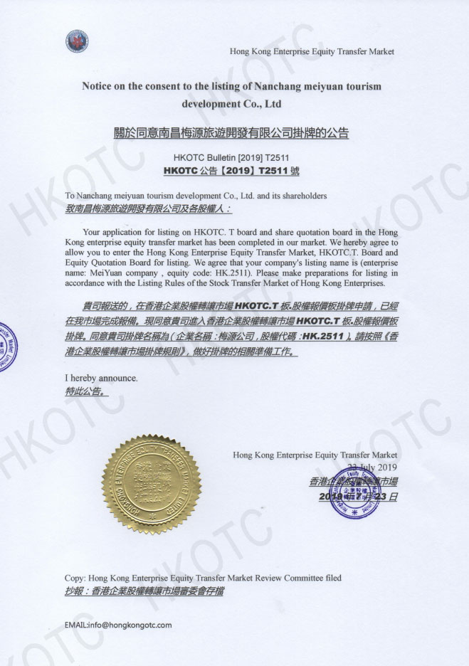 關於同意南昌梅源旅遊開發有限公司掛牌的公告