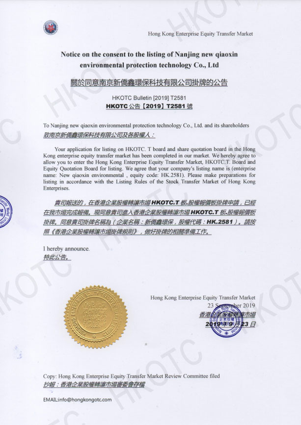 關於同意南京新僑鑫環保科技有限公司掛牌的公告