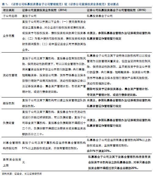 私募业务范围松弛有度,另类监管正式落实到细则。私募子公司监管调整较为明显,相较于2014 年《证券公司直接投资业务规范》,新规主要变化:
